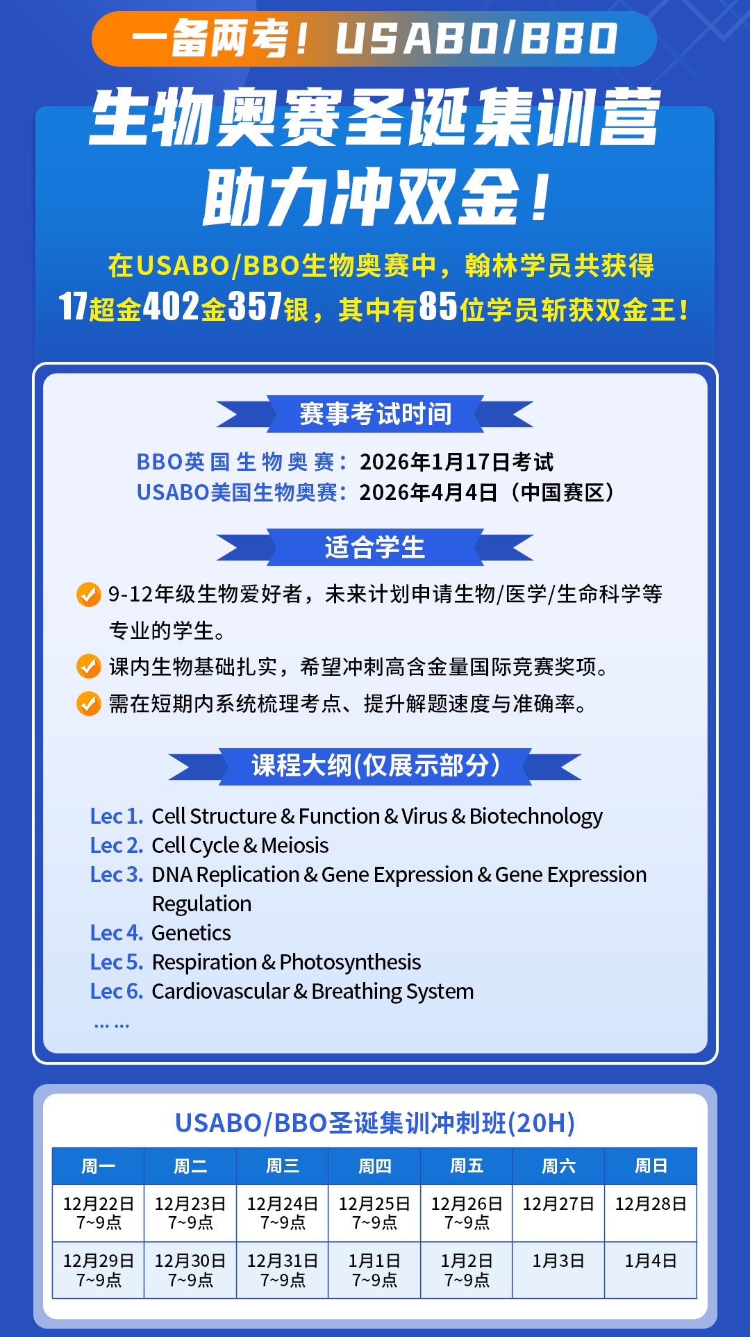 BBO竞赛考试大纲比A-level更加广泛,与A-level等标化考试较大的差异是,竞赛考试会更为灵便,这就必须学生做很多的复习练习,加强竞赛答题逻辑思维,保证举一反三。课程以权威的Campbell生物学为基础,内容安排上以BBO为参照,在教授大学水平的生物学内容的同时,也尽可能的培养生物思维和高水平生物竞赛所需的解题思路。该课程不仅有助于在BBO中拿奖,有可以帮助在AP生物学,USABO,多伦多生物竞赛, SAT2生物考试中取得高分。